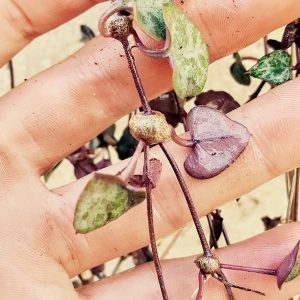 Unsere Sukkulente des Monats August ist eine wunderschöne Ampelpflanze: die Ceropegia woodii. Mit ihren herzförmigen Blättern ist sie ein absoluter Blickfang. Ceropegia woodii ist im tropischen Afrika heimisch. Die Leuchterblume besitzt einen knolligen, sukkulenten Wurzelstock. Die bis zu 2m langen, fadendünnen Triebe tragen silbrig gezeichnete, marmorierte, herzförmige, fleischige Blätter. Mit den Jahren bilden sich in den Blattachseln kleine Knöllchen.