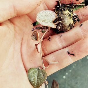 5. Nach einigen Wochen sollten Wurzeln und eine kleine Knolle am Ende des Stiels wachsen. Bald kann diese Knolle eine ganz neue Reihe von Herzen wachsen lassen 💚
