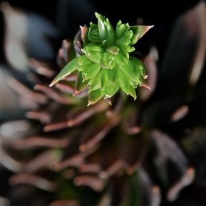 Die Farbe der Blätter variiert je nach Standort und Jahreszeit zwischen schwarz- , dunkelbraun- schokoladig- und einem dunklen Purpur. Zur Mitte der Rosette hin verlaufen diese kräftigen Farben in einen sanften gelblichen Grünton. Die Blätter sind sukkulent, dafür relativ dünn und dreieckig. Sie sind an ihrer Basis bis zu 2,5 cm breit und laufen nach vorne spitzer zu.