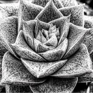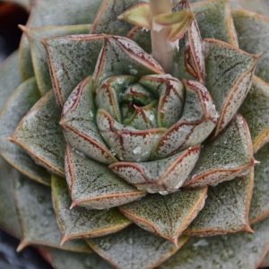 Echeveria purpusorum ist eine sehr sehr langsam wachsende, ungewöhnliche Sukkulente. Ihre Oberflächenmusterung, die durch Sonneneinstrahlung und Trockenstress noch stärker hervortritt, erinnert entfernt an ein Mandala.