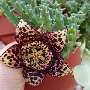 Unsere wunderbar maritim und spannend aussehende Sukkulente des Monats März. Stapelia desmetiana ist eine recht schnell wachsende Sukkulente – optimal zum Starten einer Sammlung, da sie einiges mehr verzeiht als viele andere Sukkulenten.